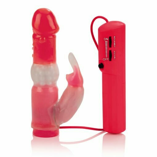The vibrant sex toy is made from unscented, phthalate free PVC and has an attached ABS controller. The pliable penis shaped stimulator features a bunny shaped clitoral teaser with flickering ears and has powerful reverse rotation action. Dual roll dial controls allow quick vibration speed changes so that your arousal progresses from tantalizing tingles to ultimate pleasure. The bunny teaser can also be used independently.